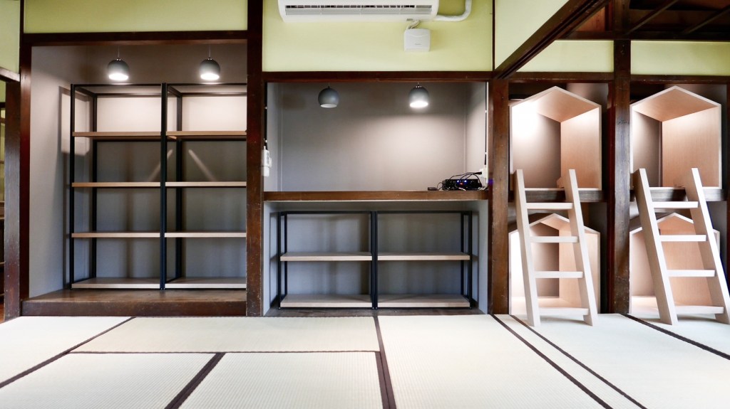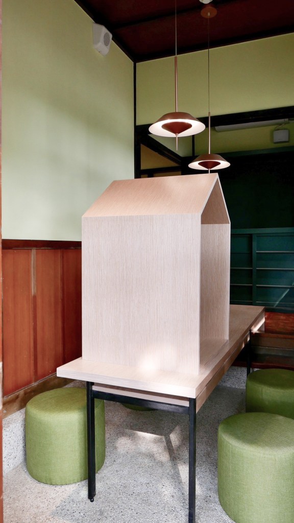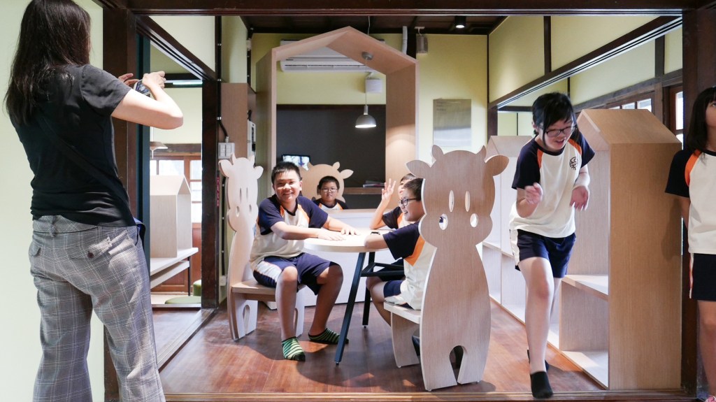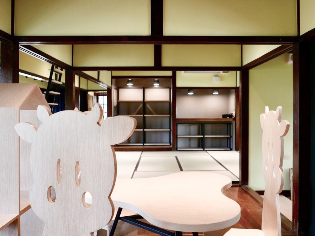 在空間上,我們希望可以在日式建築內有著一些活潑感,輕鬆隨意且有著遊戲性,坐著、躺著、臥著,甚至躲起來。我們同時也希望小朋友在使用空間的同時可以多體會建築的構築狀況,所以我們適當地把局部內天花板打開,架設爬梯,讓小朋友可以爬上去,觀看平常看不到的神秘屋架空間,屋架空間未來也可以讓校方製作一些裝置設計(如吊裝小飛機,閱讀小天使之類的、或跟繪本書故事結合的小場景模型)創造出另外一片想像天地。