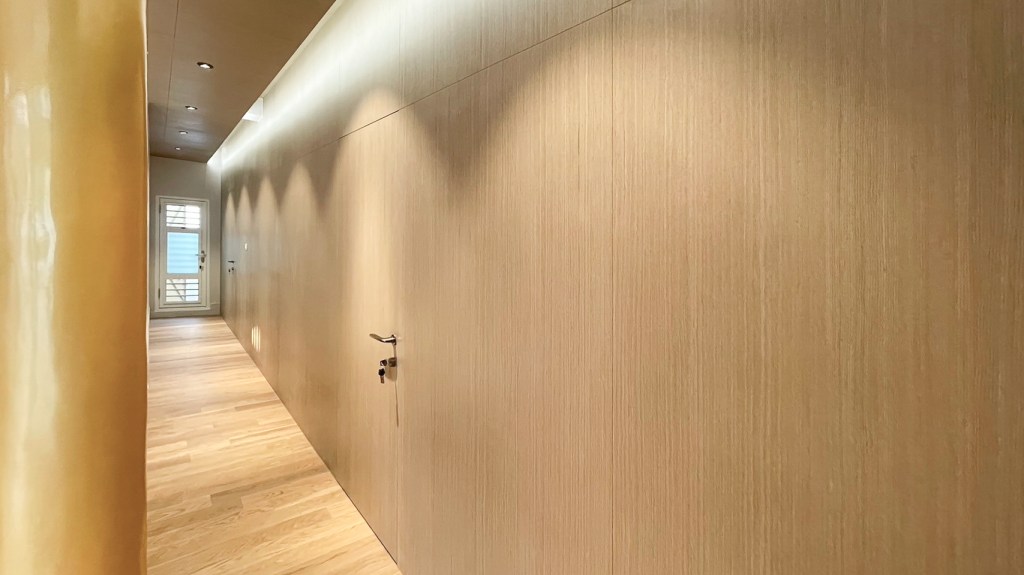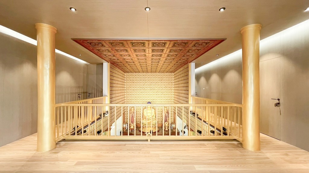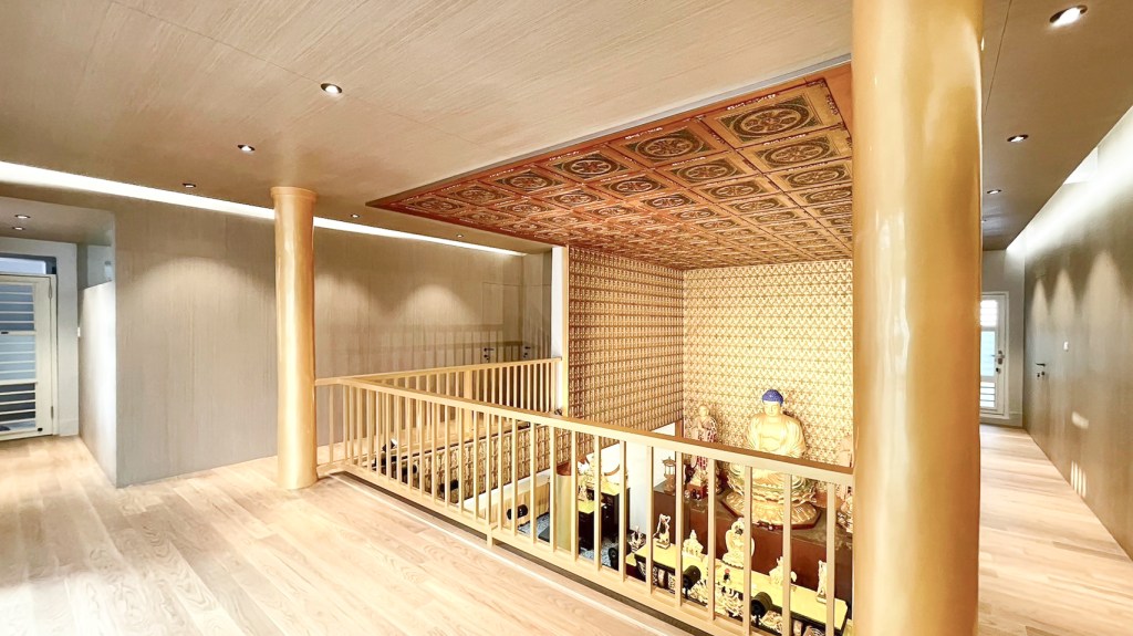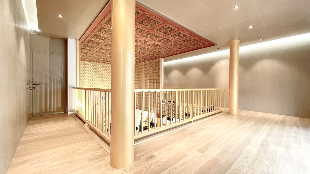 這個案子也是極為老舊的空間改善,設計的主要概念是將原本二樓的隔間牆再往後退縮,讓大殿的空間可以更開闊並釋放視野,引入大量的實木木紋質感,以創造空間的質樸感及自然感,簡單的線條配合隱藏門,讓牆體隔間更加俐落與清晰。重新運用金漆冷烤四點金柱,配合自然灑入的光線,讓大殿空間更加莊嚴氣派,並串接上下空間。