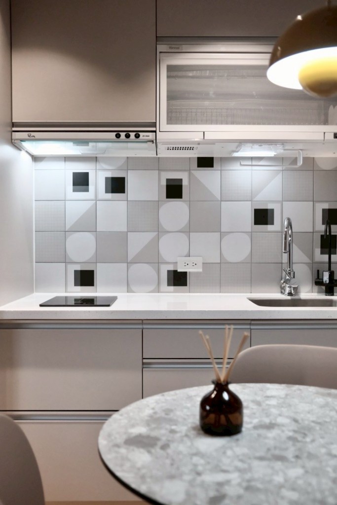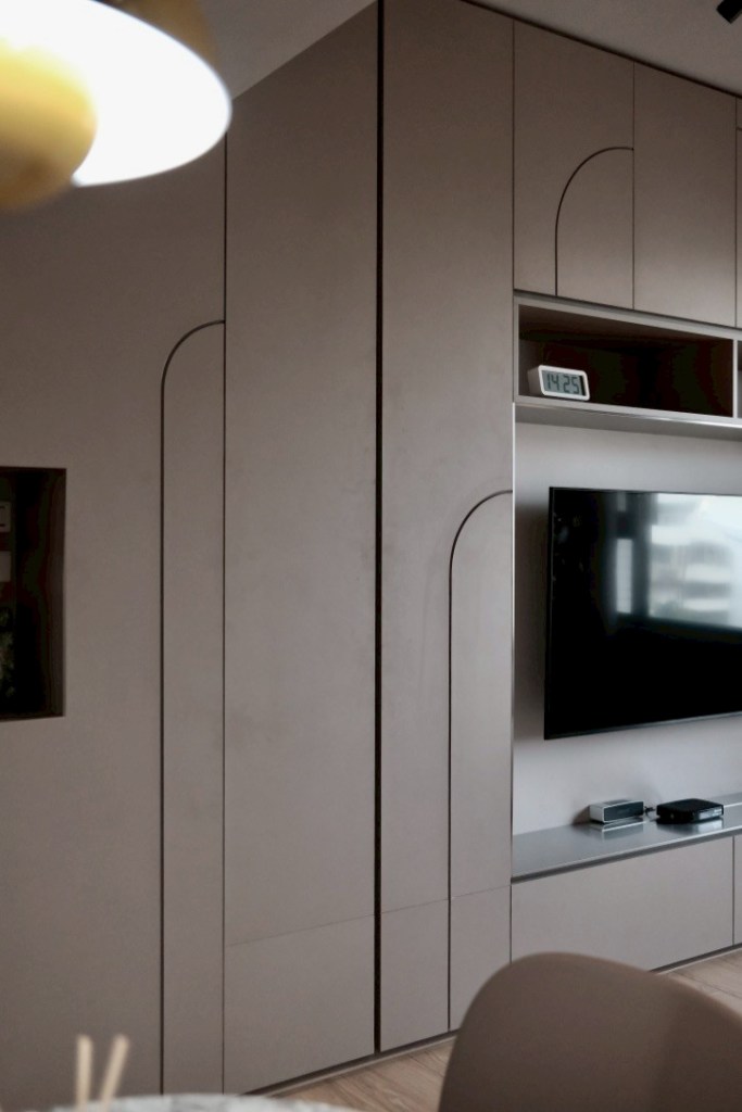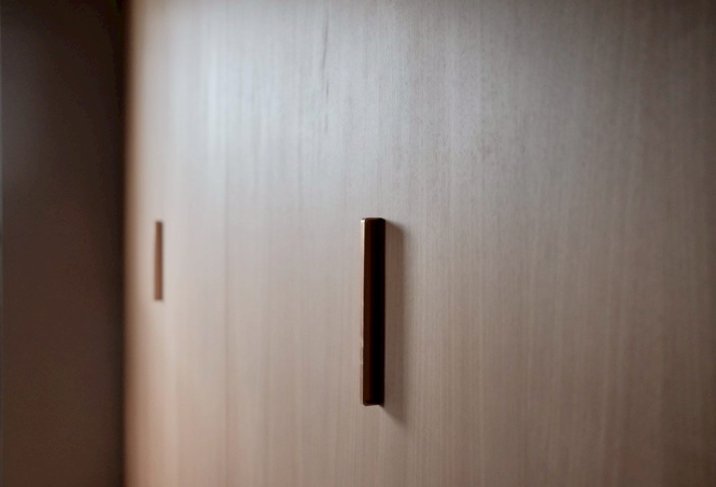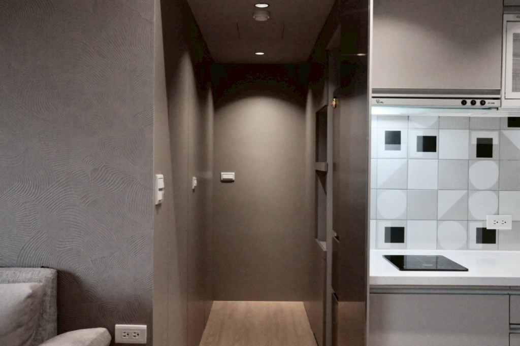 我們重新分配界定私密與公共空間位置–廚房與客廳間空間,調整房間的隔間與尺寸、植入活動儲藏櫃,讓空間多一些彈性,我們甚至在有限的空間中隔出了儲藏室,以方便大型行李箱及吸塵器的收納儲放。藏匿所有的管線,空調亦則採用吊隱式室內機,因為不間斷的空間邊際線才能持續放大空間感受。沒有過多的裝飾線條,我們純粹讓好的材料表情發言,以展現空間的內涵與力量。
